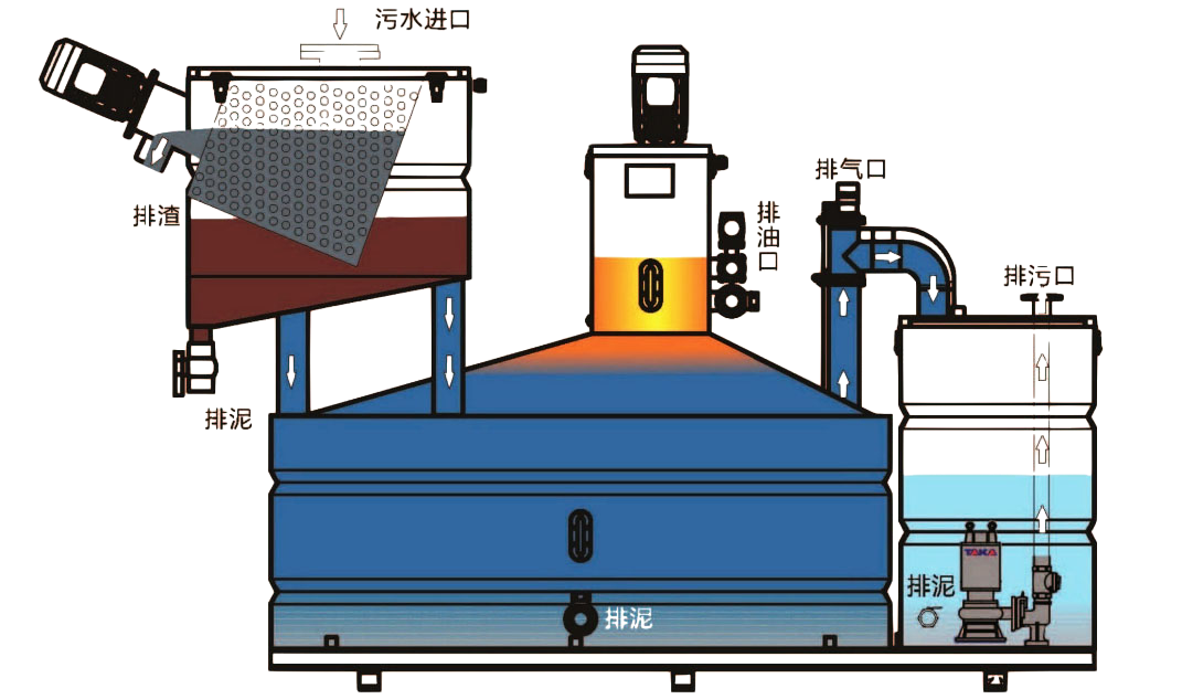 項(xiàng)目地點(diǎn): 安徽省蚌埠市五河縣 安裝背景: 一種餐飲油水分離器,主要涉及一種能處理賓館、飯店、學(xué)校、企業(yè)、機(jī)關(guān)等大型餐飲飲食場(chǎng)所的“餐飲泔水”的餐飲油水分離器。由殼體,下水口,出水口,及出油口等組成;其中殼體內(nèi)有能分隔殼體內(nèi)殘?jiān)耙后w空間的隔水...